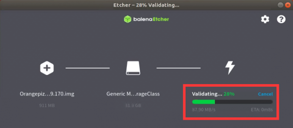 9)After the Linux image is burned, balenaEtcher will also verify the image burned to the TF card by default to ensure that there is no problem in the burning process. As shown in the figure below, a green progress bar indicates that the image has been burned, and balenaEtcher is verifying the burned image.